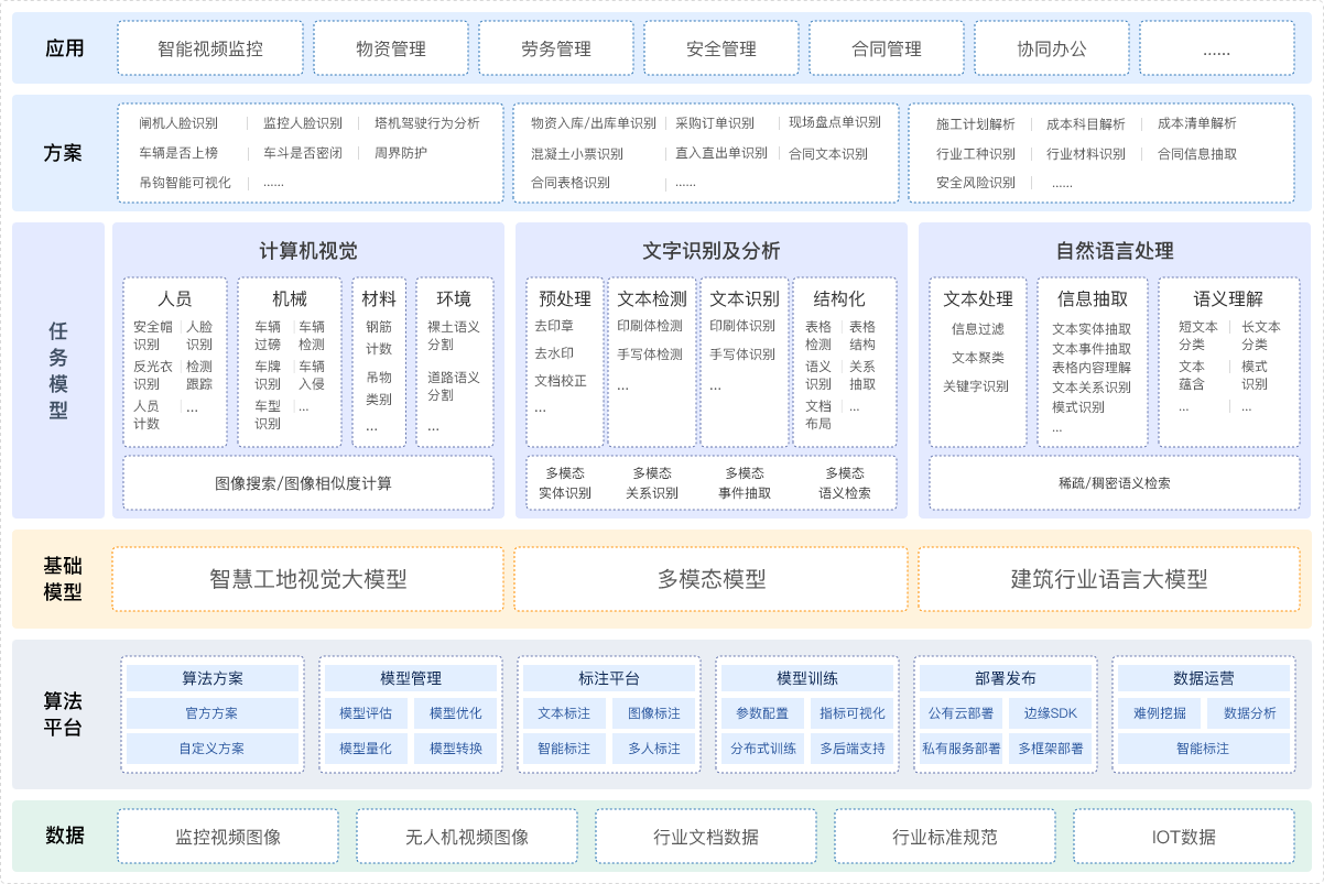 基于海量的建筑行业数据及广联达自研算法开发平台,打造包含以行业大模型为底座的算法矩阵、 以建筑行业know-how为核心的算法方案,最终应用到各个数字化业务系统中。